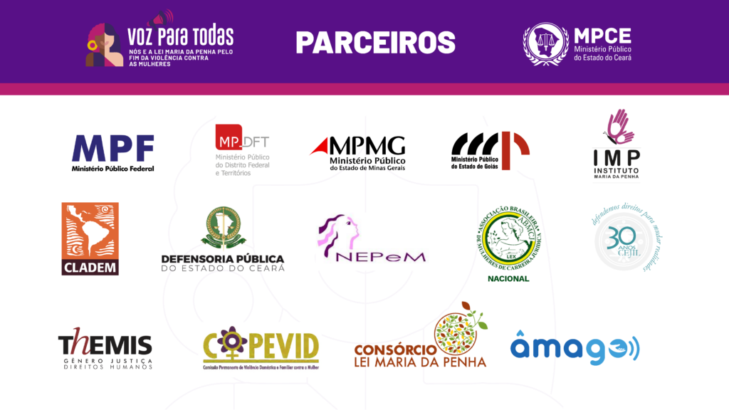 O Ministério Público do Estado do Ceará, por meio do Núcleo Estadual de Gênero Pró-Mulher (NUPROM) e em conjunto com inúmeros parceiros de atuação local e nacional, apresenta a campanha “Voz para todas – Nós e a Lei Maria da Penha pelo fim da violência contra as mulheres”. Com lançamento oficial no dia 25 de novembro, a primeira fase segue até o dia 10 de dezembro. A programação inclui a publicação de conteúdos educativos em redes sociais e promoção de eventos virtuais sobre o tema.