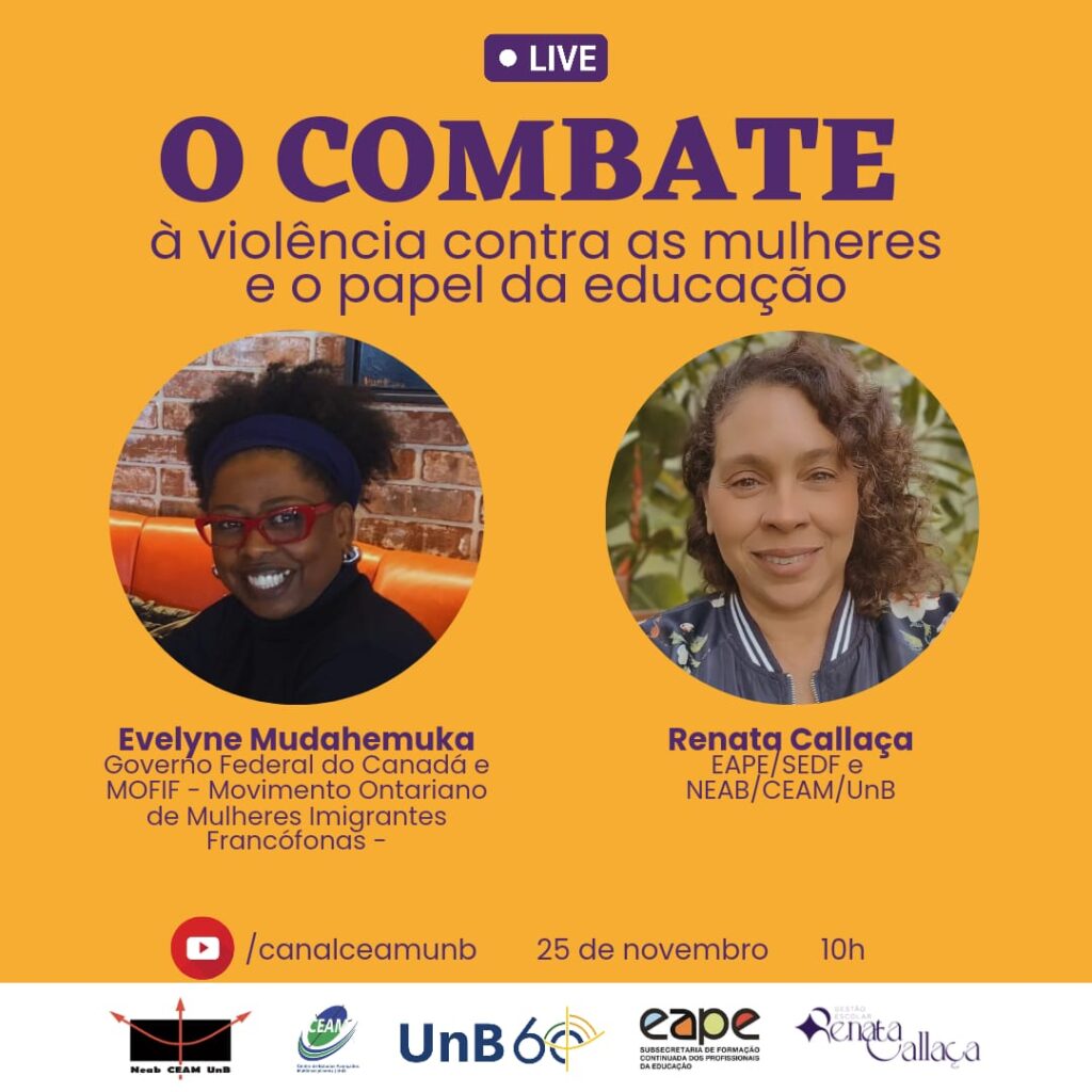 O Combate à Violência Contra as Mulheres Evento Online10:00 – 11:0025/11/2022 NEAB – O Combate à Violência Contra as Mulheres e o Papel da EducaçãoEvento online em referência à Semana da Consciência Negra e Novembro Negro / 2022 Participantes: Evelyne Mudahemuka – Governo Federal Canadá e Movimento Ontariano de Mulheres Imigrantes Francófonas (MOFIF) Renata Callaça – Secretaria de Educação/DF e NEAB/CEAM/UnB Acesso: Canal CEAM/UnB – Youtube