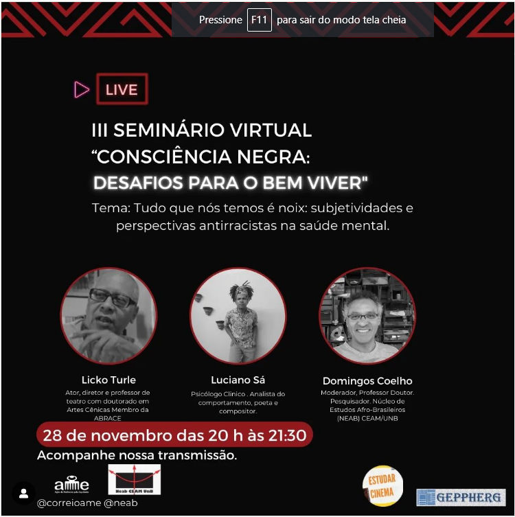 . A AME- Ação de Mulheres pela Equidade e o NEAB – Núcleo de Estudos Afro-Brasileiros CEAM/UnB, com apoio do Estudar Cinema da Universidade de Brasília realizam no Dia 28 de Novembro de 20h as 21h o III Seminário Virtual “Consciência Negra Desafios para o bem Viver” que será um espaço de debates e reflexões sobre saúde mental arte e cultura para dialogar sobre o impacto dos Racismos e seus enfrentamentos.