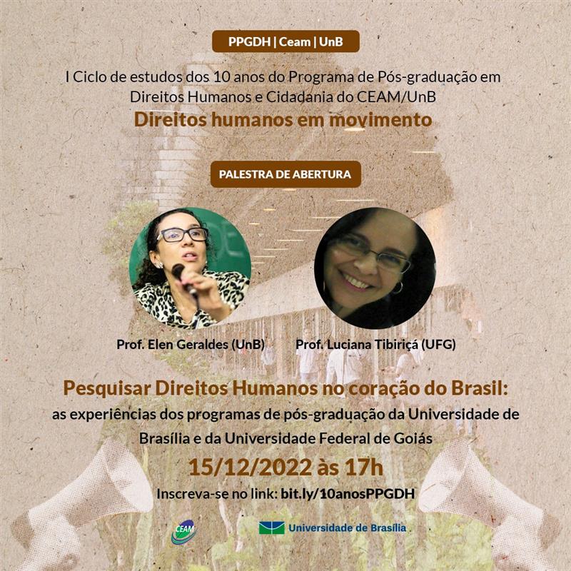 O I Ciclo de estudos dos 10 anos do PPGDH, “Direitos Humanos em movimento”, será constituído por uma série de palestras, apresentação de trabalhos, publicação de livros, aulas e homenagens, online e presenciais, realizadas a partir de dezembro de 2022 e em 2023, com o objetivo de contar a história de nosso programa, mostrar outros programas parceiros, apresentar estudos em andamento, discutir a internacionalização, valorizar os pesquisadores e pesquisadoras que construíram essa trajetória e verificar diretrizes dos órgãos de avaliação e fomento.