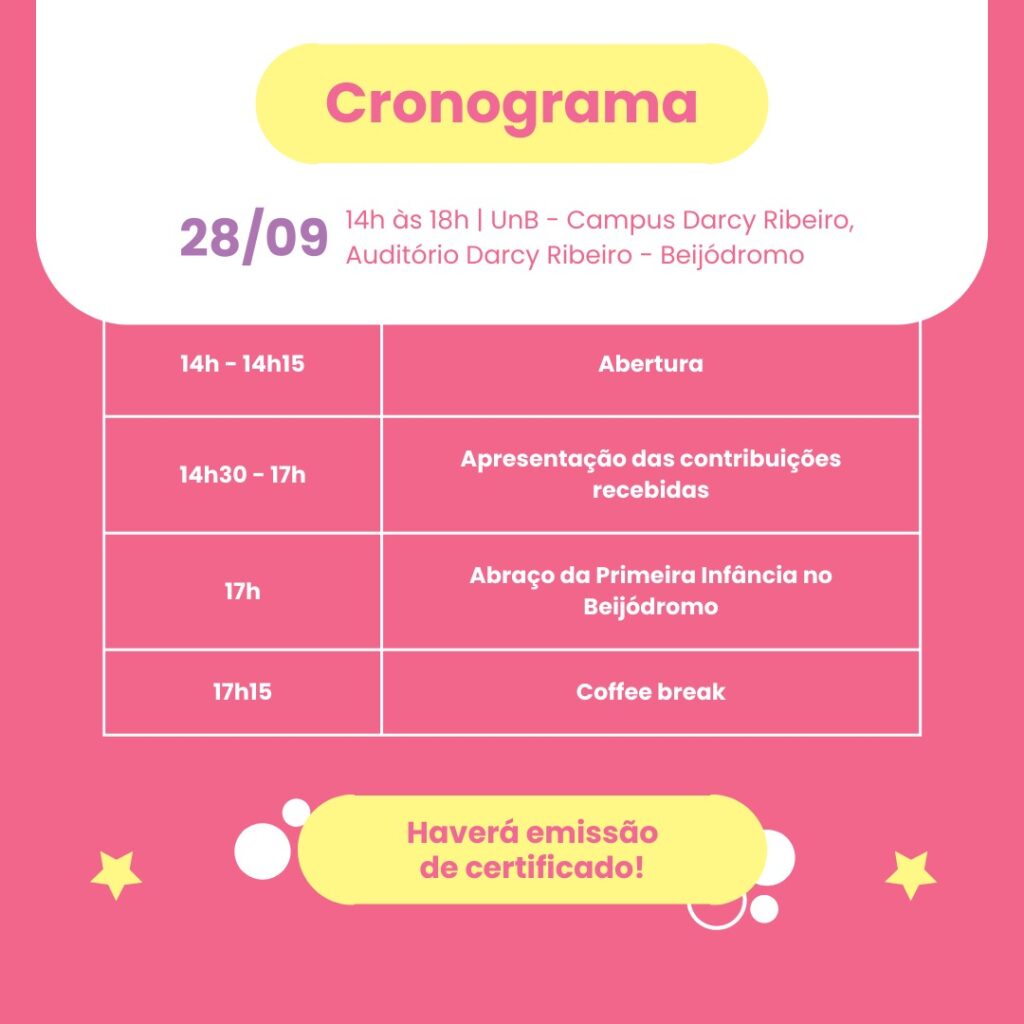 O evento ocorrerá em 28/09/2023 das 14h às 18h no Beijódromo no Campus Darcy Ribeiro (UnB), conforme cronograma abaixo: